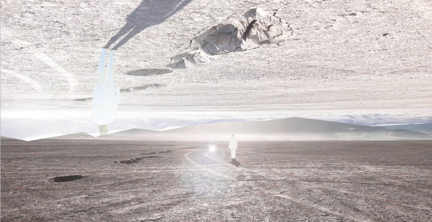 “A Parallel Collapse” is a continuation of my last video piece “A Virtual Body In A Simulated World–According To A Cartesian Plane.” The artist’s body is clothed in a green screen suit and super-imposed with a white matte still frame. The video footage has been edited and combined in such a way that the horizons disappear into each other– the two parallel worlds meld into one and occur simultaneously. The figure within the frame performs repetitive actions ranging from falling to walking in a line. The walking figure continually dissolves into a walking figure. The body appears in motion; however, it never accomplishes traversing a significant distance. The falling action is followed by another falling action. These two frames are juxtaposed next to each other, placing emphasis on the continual collapse action and the circular walking motion.