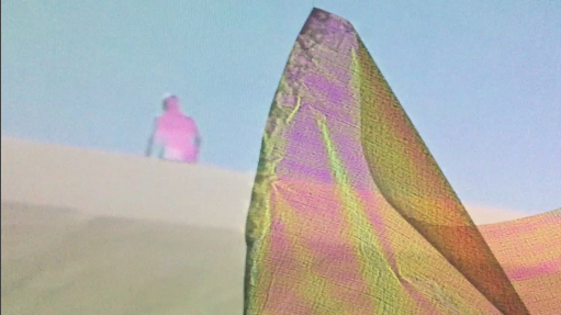 Pixelated Phenomena, 2015, explores notions of the contemporary sublime in relation to the performative body. The human form, clothed in a green screen morph suit, explores California’s diverse natural landscapes. The color green has been keyed out and exchanged with a variety of iridescent surfaces.
