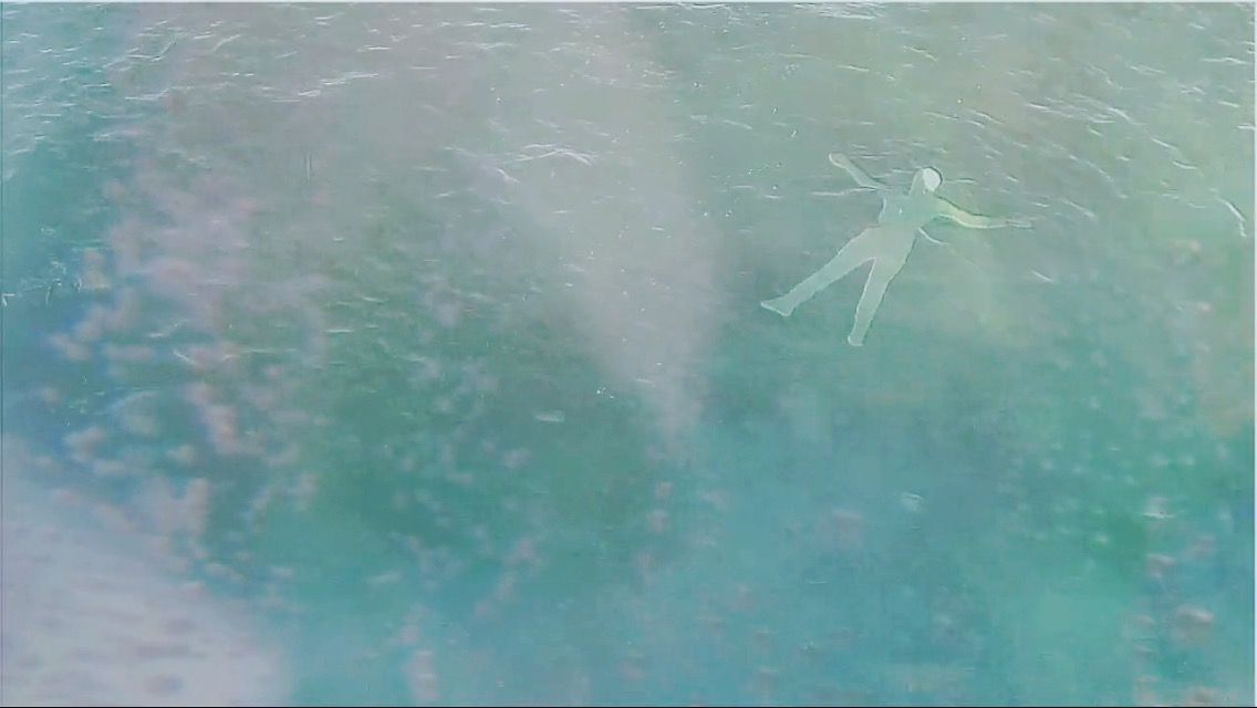 This work is informed by my previous piece Digital Iridescence, 2015, in which the body is entirely submerged in water. Oceanic Drift presents an aerial view of the figure that is filmed from a distant space above the water, whereas Digital Iridescence is filmed underwater and from a relatively close distance. These two works, read in concert with one another, are an exploration of planar space that recall Babette Mangolte’s Calico Mingling. Mangolte’s film depicts a choreographed dance from a multitude of angles–each camera angle presents a new interpretation of the dance. In the case of Oceanic Drift, the singular camera angle emphasizes the body’s movement, or drift, in equilibrium with its environment.