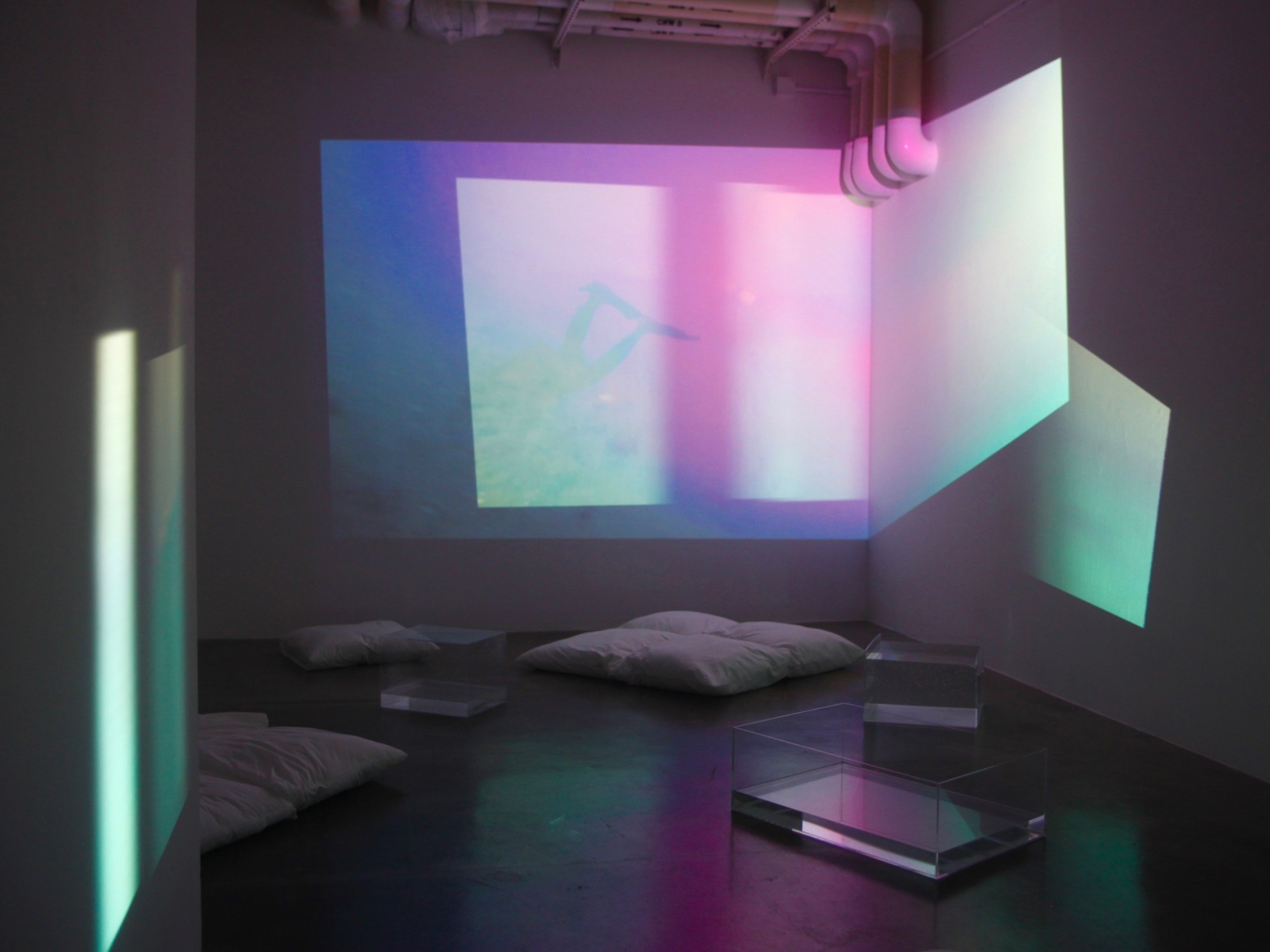 liquid liminal(ity), 2017, examines corporeality in deep oceanic space. The installation serves as an ontological and phenomenological exploration of depth and flatness within screen space and gallery space.