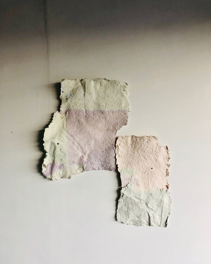 October 16, 2020May 31, 2022 Untitled Diptych, 2020. Handmade paper from recycled materials, sidewalk chalk, and unemployment receipts. Share this: Share on X (Opens in new window) X Share on Facebook (Opens in new window) Facebook Like Loading... Related