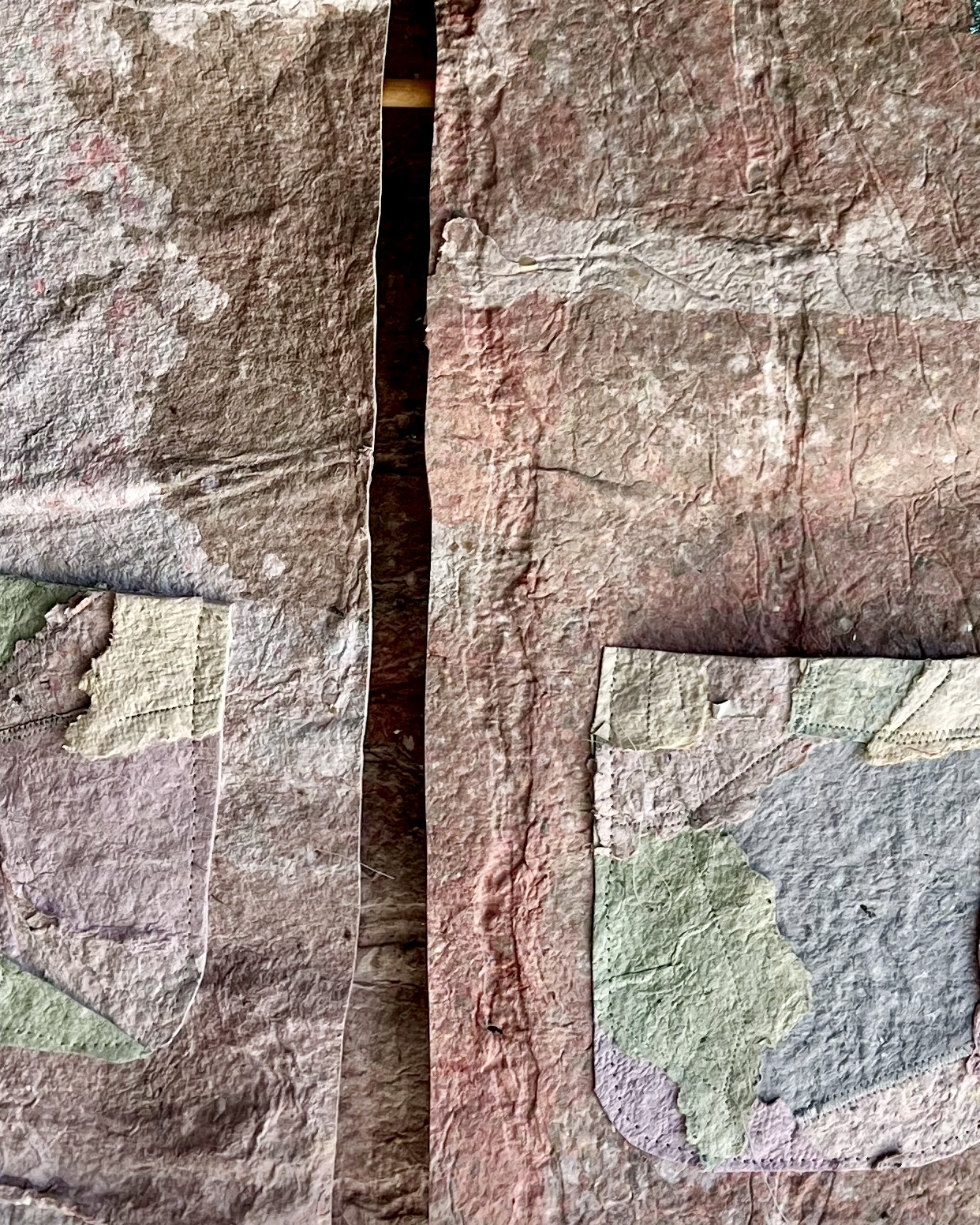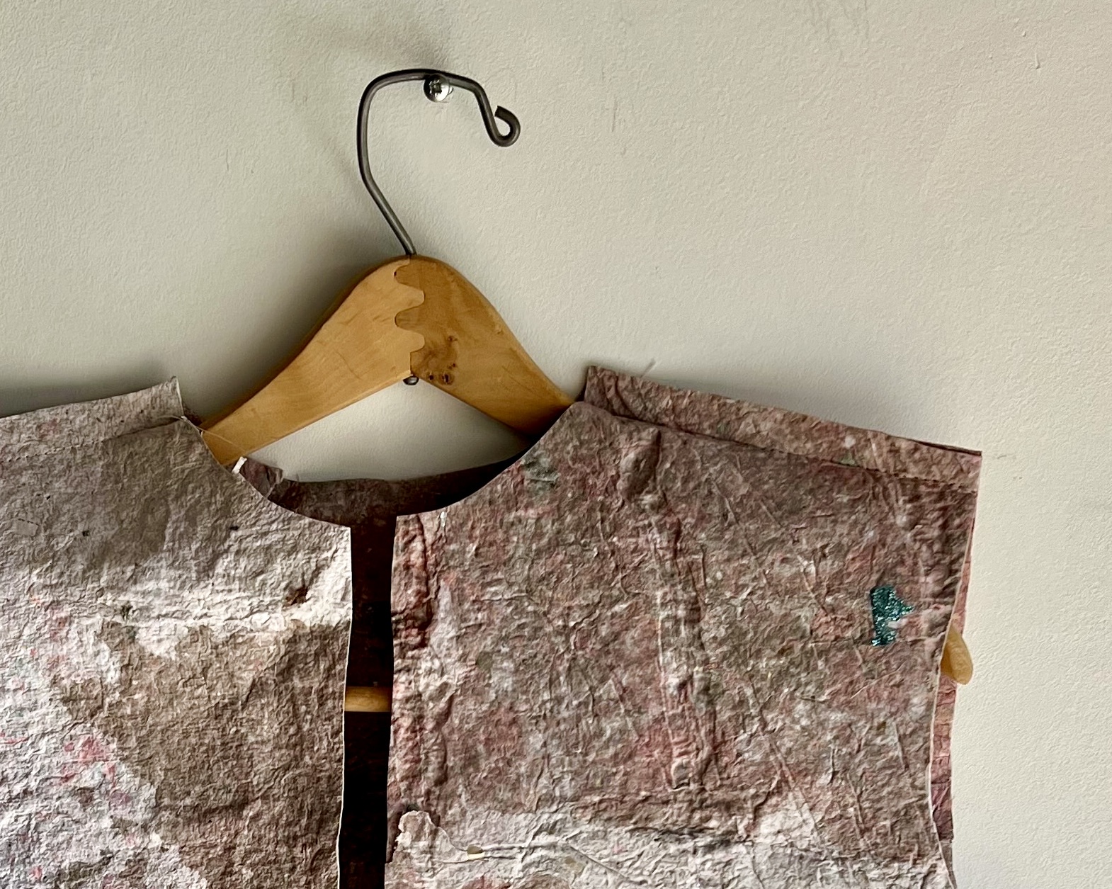 Birthday Vest, 2022, wood hanger, handmade paper out of used gift wrap and ribbons, and thread, 24″ x24″